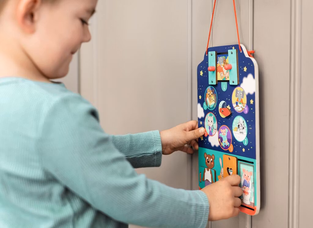 Tavla med luckor och skjutpartier för de minsta med bilder för godnatt-rutinen.
