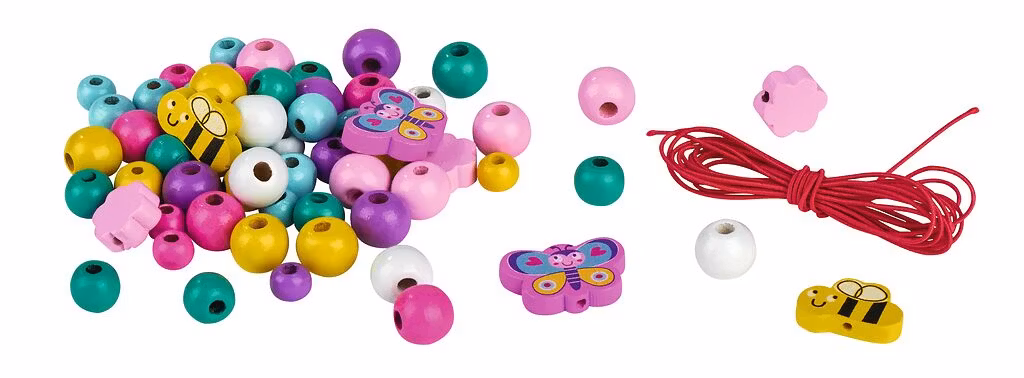 Träpärlor i praktisk burk. 252 st pärlor i 3 storlekar. 18 st motivpärlor och 2 meter elastiskt band. Räcker till ca 15 armband för barn. OBS! Ej för barn under 3 år.